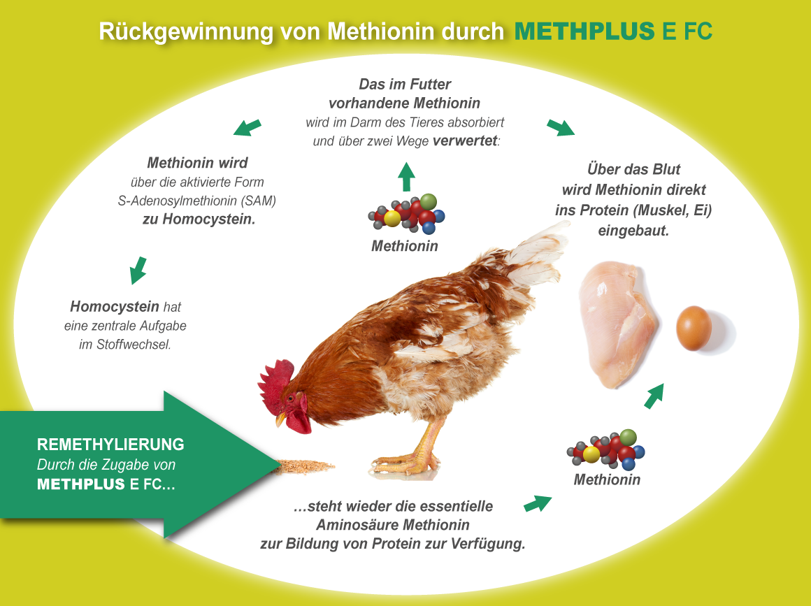 Methionin hat große Bedeutung im Stoffwechsel für die Proteinsynthese. Die Aminosäure ist Lieferant von bio-chemischen Verbindungen, die für wesentliche Biosynthesen benötigt werden, wie z. B. bei der Ei-Produktion, der Körpermasseentwicklung und für eine gute Federbildung.