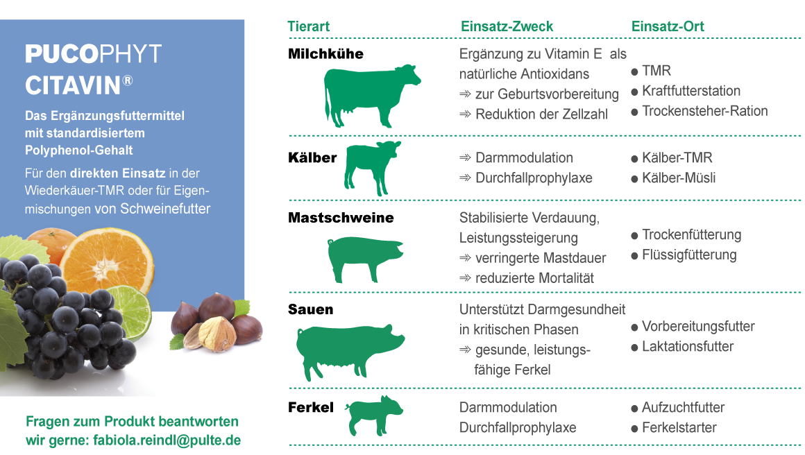 Als Ergänzungsfuttermittel eignet sich CITAVIN daher als Lieferant von Antioxidantien zum Schutz vor oxidativem Stress und fördert überdies die Darmgesundheit.