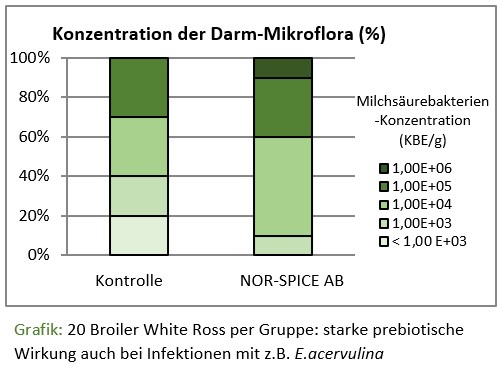 Es gilt die Mikrobiologie des Darms im positiven Sinne zu modulieren und in Stress-Phasen gesund zu erhalten. Dies gelingt beispielsweise mit Antibiotika, welche pathogene Keime eliminieren, jedoch negative Effekte auf die nützliche Bakterienflora mit sich bringen. Eine Alternative stellen Pflanzenpräparate dar. NOR-SPICE AB wurde als natürlicher Wachstumsförderer entwickelt, der die Anpassung der Darmmikrobiota an sich ändernde Lebensumstände unterstützt, wie zum Beispiel während dem Absetzen oder dem Umstallen. (Chicoteau et al, 2001; Aurensan, 2012; Lamballais, 2013). Der standardisierte Citrusextrakt ist reich an Citroflavonoiden, Pektin-Oligosacchariden, organischen Säuren, Limonene und ätherischem Citrusöl. Dieser Wirkstoffkomplex wirkt als Booster auf die positiven Milchsäurebakterien und unterdrückt gleichzeitig pathogene Keime wie E. coli. Die Gesunderhaltung des Darms ist gesichert und die Leistungsfähigkeit der Tiere garantiert, was zahlreiche Versuche belegen. In mehr als 14 Geflügelversuchen wurde eine Verbesserung der täglichen Zunahmen um 5,3% und der Futterverwertung um 2,5% erzielt. Auch in der Eierproduktion wurden gute Ergebnisse sowohl bei quantitativen als auch qualitativen Parametern mit einer verbesserten Eimasseproduktion und Schalenstabilität beobachtet.
