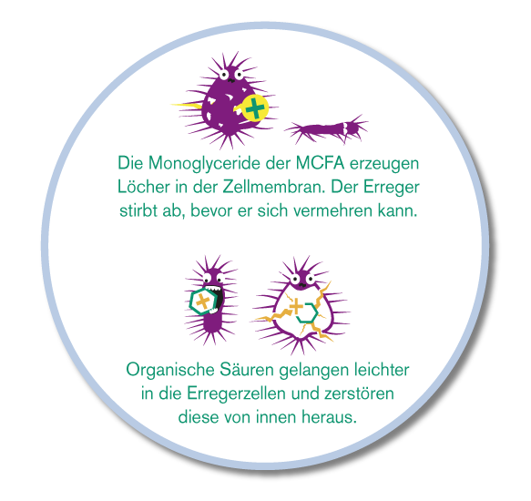 - Sie wirken nicht nur über den gesamten Verdauungstrakt hinweg, sondern haben darüber hinaus gegenüber MCFA eine noch stärkere Hemmwirkung gegenüber unerwünschten Mikroorganismen